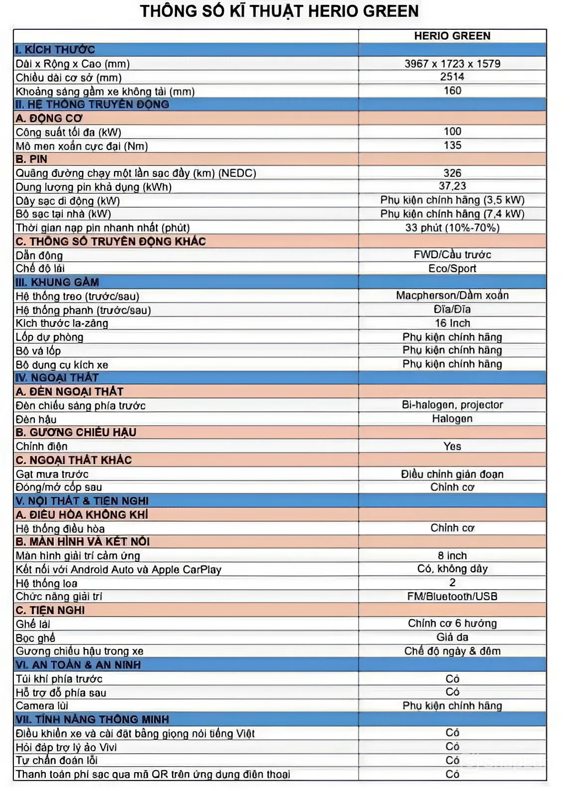 THÔNG SỐ KỸ THUẬT CƠ BẢN VINFAST Herio Green
