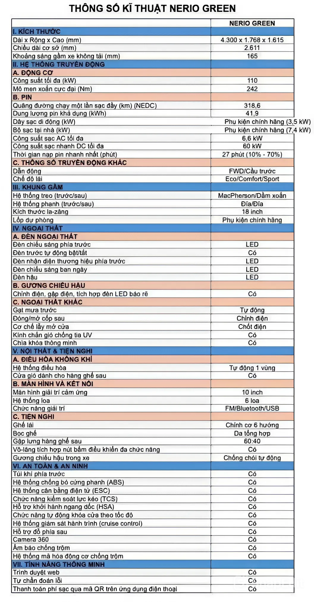 Nerio Green có chiều dài cơ sở lên tới 2.611 mm, chiều dài tổng thể 4.300 mm, mang đến không gian nội thất rộng rãi, thoải mái cùng khoang chứa đồ lớn, phù hợp với phân khúc dịch vụ cao cấp hơn. Xe hướng đến nhóm khách hàng đề cao trải nghiệm ở hàng ghế sau cùng những tính năng thông minh, công nghệ an toàn hiện đại. Nerio Green có khả năng di chuyển tối đa hơn 318 km sau mỗi lần sạc đầy, thời gian sạc pin từ 10% lên 70% chỉ trong 27 phút.